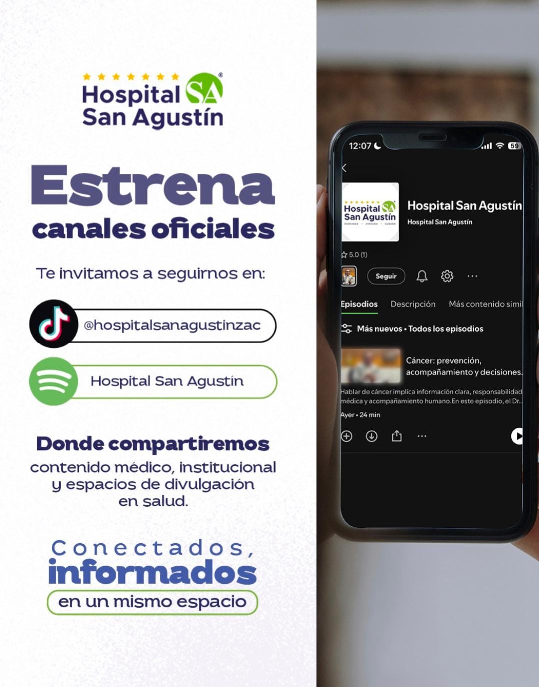Hospital San Agustín abre canales oficiales en Spotify y TikTok, donde compartiremos información médica confiable, educación en salud, pláticas con especialistas y contenidos que permiten conocer de forma cercana quiénes somos y cómo trabajamos.